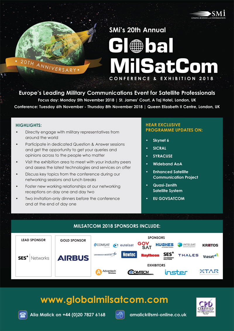 SMi Group are proud to announce that the 20th annual Global MilSatCom conference and exhibition will return to London on 6th, 7th and 8th November and a Small Satellite and Disruptive Space Technology Focus Day on the 5th November.